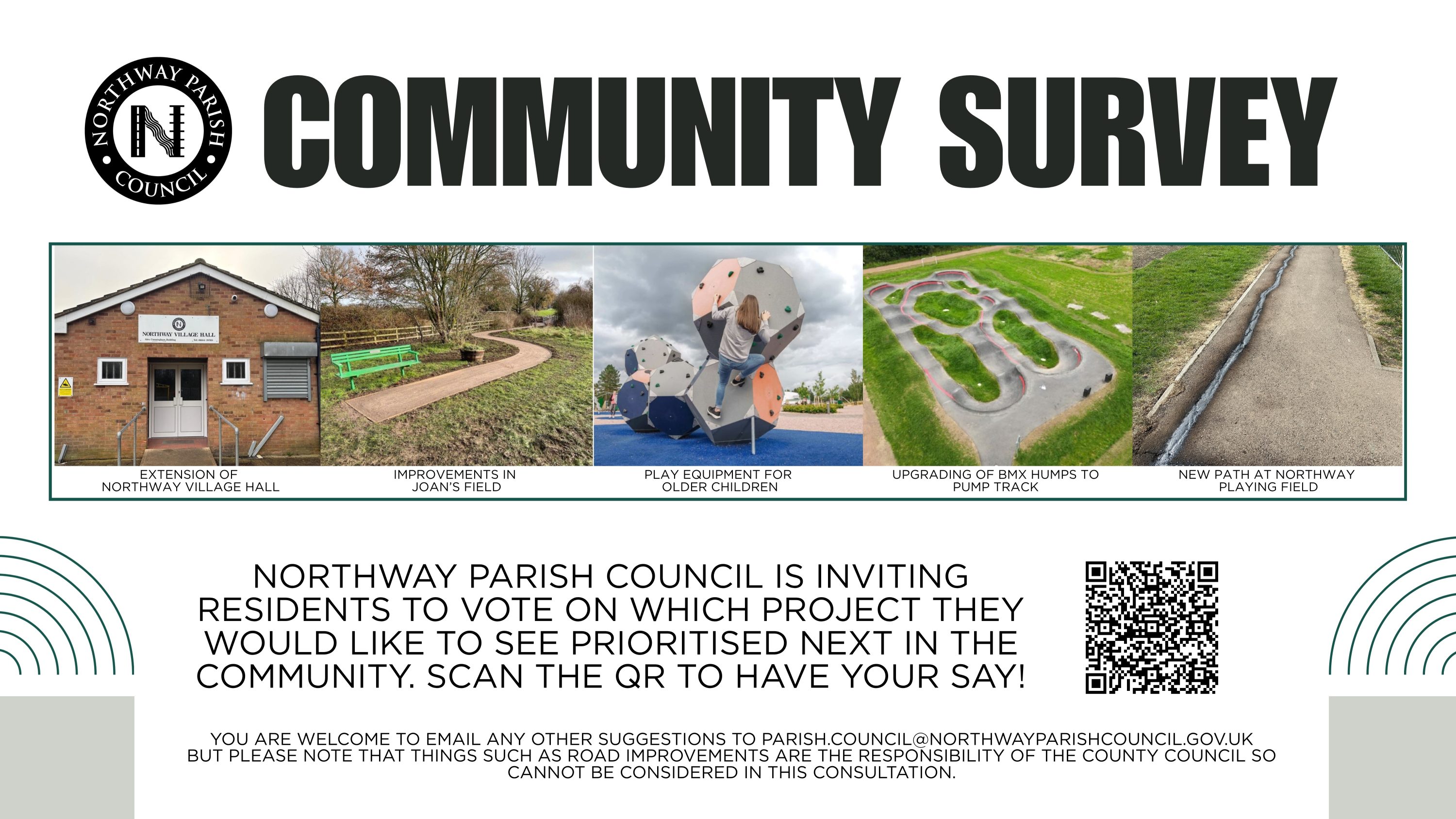 Northway Parish Council is responsible for managing local facilities, such as the Community Hub, Playing Field, Joan's Field and Platinum Park. Council policies, governance documents, and financial records are also publicly accessible. Northway Parish Council is committed to making Northway a better place in which people can live, work and play. Please use this website to find information on the Council, its policies, upcoming meetings and local news.